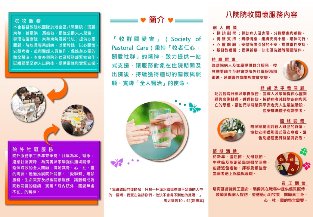 本著耶穌基督的教導,以優質「全人關顧」的專業精神,服事院內外病患者及其家屬、醫院員工及教會,彰顯上帝的愛,邁向豐盛人生。