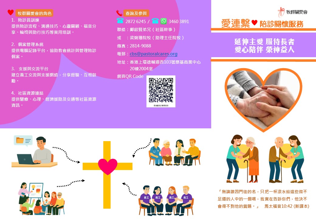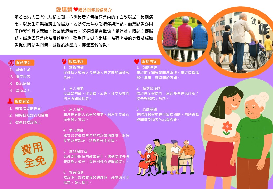 現推動「愛連繫」陪診關懷服務,我們誠邀各教會成為陪診單位,連繫各單位形成陪診愛心網絡,專為有需要陪診的長者及照顧者,