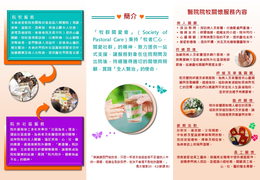 本著耶穌基督的教導,以優質「全人關顧」的專業精神,服事院內外病患者及其家屬、醫院員工及教會,彰顯上帝的愛,邁向豐盛人生。