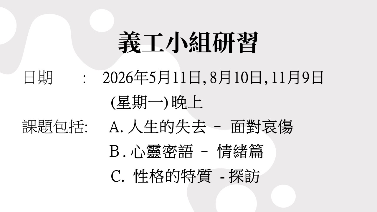 首頁 > 事工服務 > 牧群關愛會義工團契 > 團契2026年節目巡禮